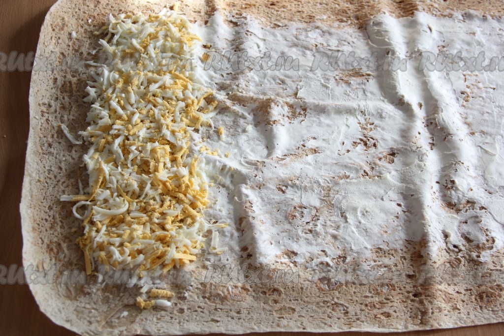 Все ингредиенты будем выкладывать поверх смазанной части лаваша. Яйца натереть на крупной тёрке, выложить вдоль короткой части лаваша в виде полоски.