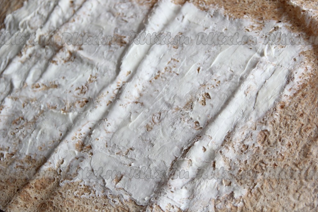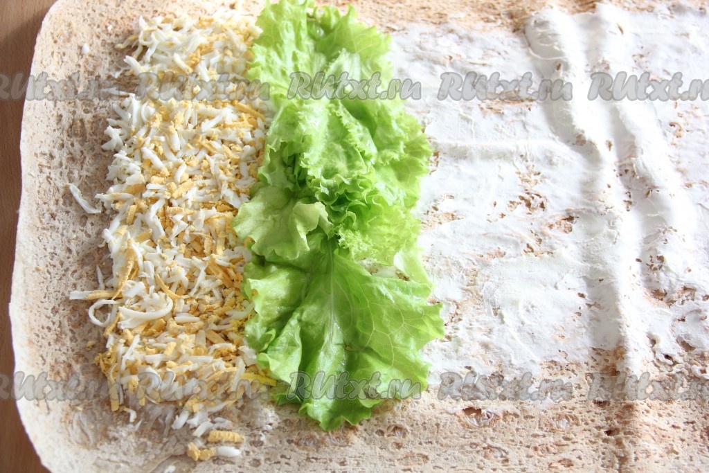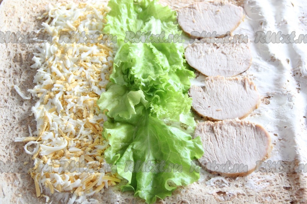 Куриное филе отварить в течение 25 минут с момента закипания подсоленной воды, затем достать и полностью остудить. Листья салата вымыть и обсушить. Яйца отварить в течение 10 минут после закипания воды, а затем полностью их остудить и очистить. Лаваш смазать творожным сыром, отступая от двух длинных и одной короткой стороны лаваша по 1-1,5 сантиметра. От второй короткой стороны лаваша нужно отступить сантиметров 10 - эта чистая часть лаваша нужна будет для того, чтобы лучше формировался рулет.
