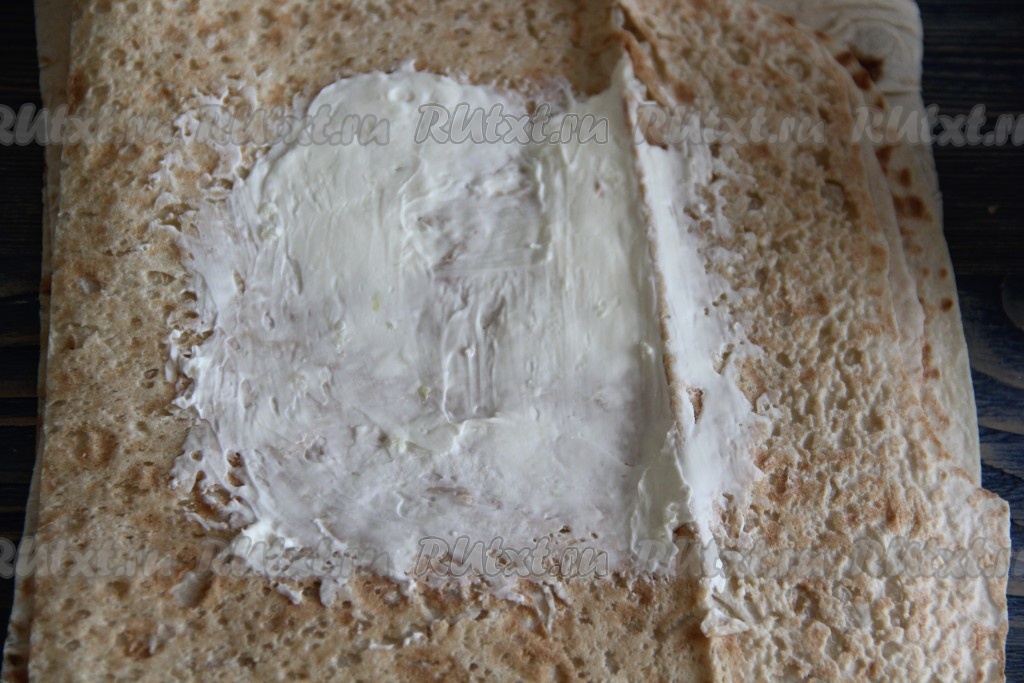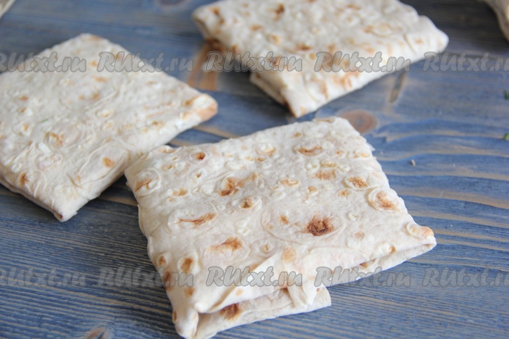 Нарезать лаваш на квадратики. Размер конвертиков выбирайте сами. Смазать середину лаваша смесью сыра и чеснока.