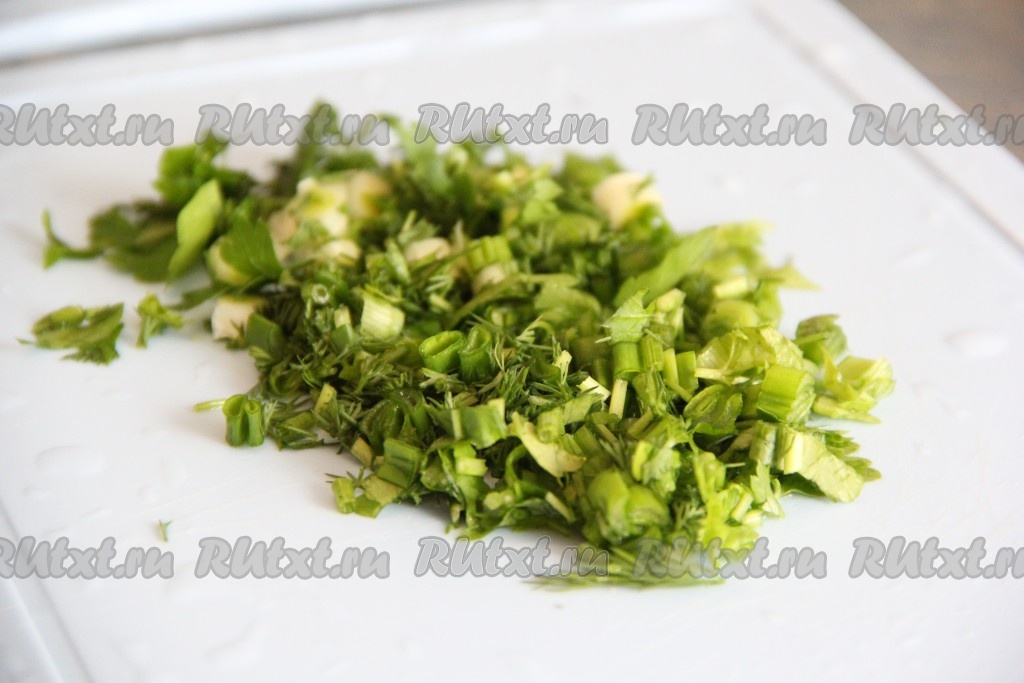 Зелень вымыть и обсушить. Мелко нарезать зелень. Я использовала петрушку, зелёный лук и укроп.