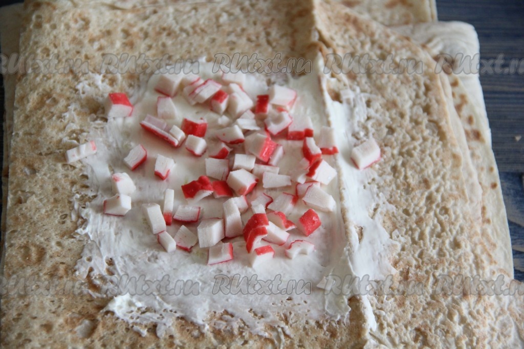 Выложить немного измельченных крабовых палочек на середину лаваша.