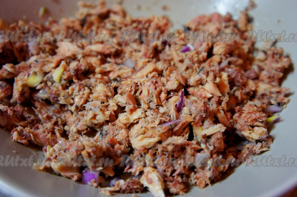 Открыть баночку с консервированной сайрой, лишнее масло слить. Выложить рыбку в тарелку, размять вилкой, а затем добавить нарезанный лук и перемешать.