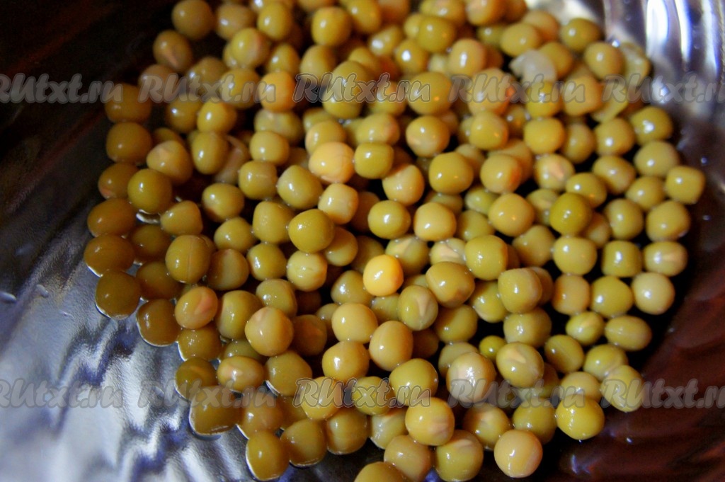 Выложить консервированный горошек, предварительно слив с него жидкость, в глубокую миску.