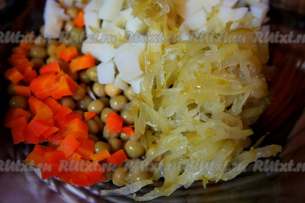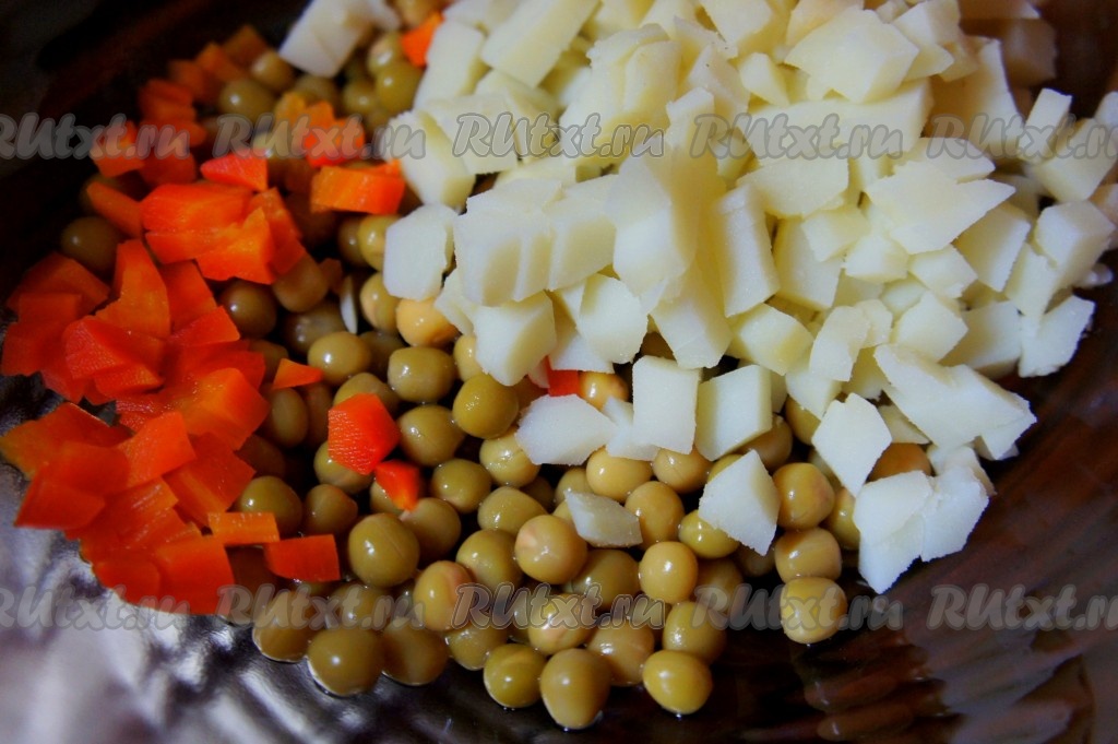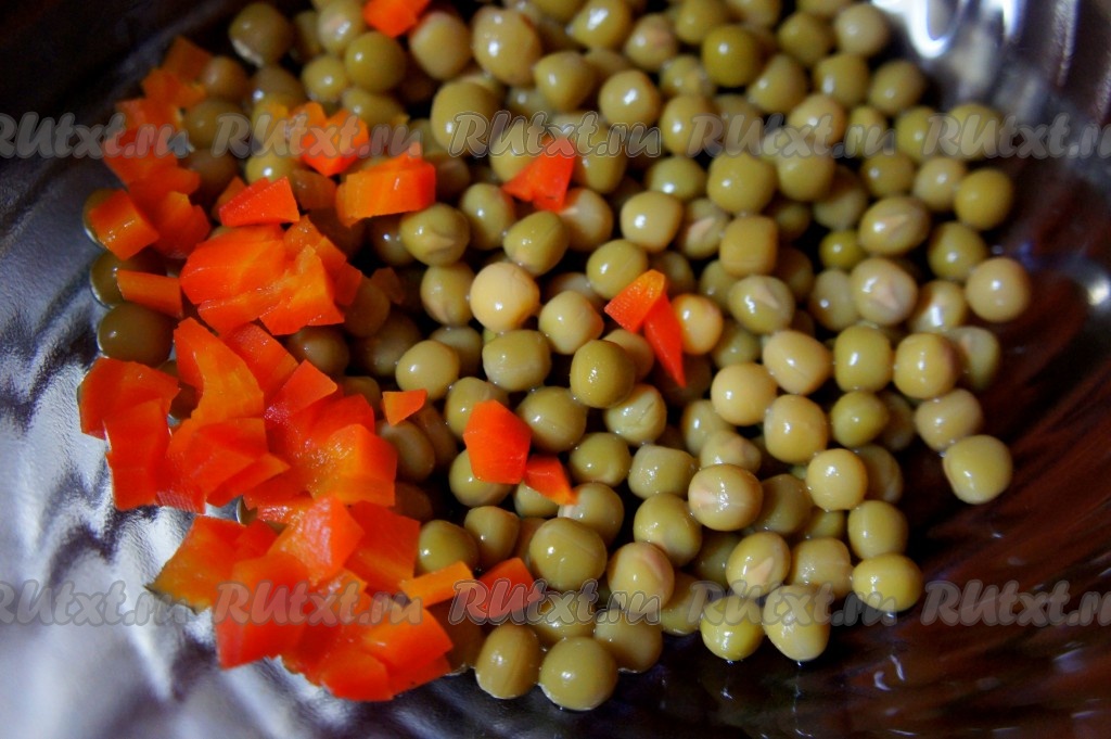 Варёную морковь очистить, мелко нарезать и добавить к горошку.