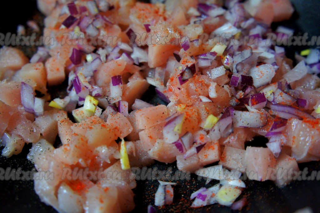 Куриную грудку и лук мелко нарезать, посолить, добавить специи и обжарить на сковороде с добавлением растительного масла на среднем огне в течение 7-10 минут, помешивая, затем остудить. Жареные кусочки мяса станут красивого золотистого цвета.