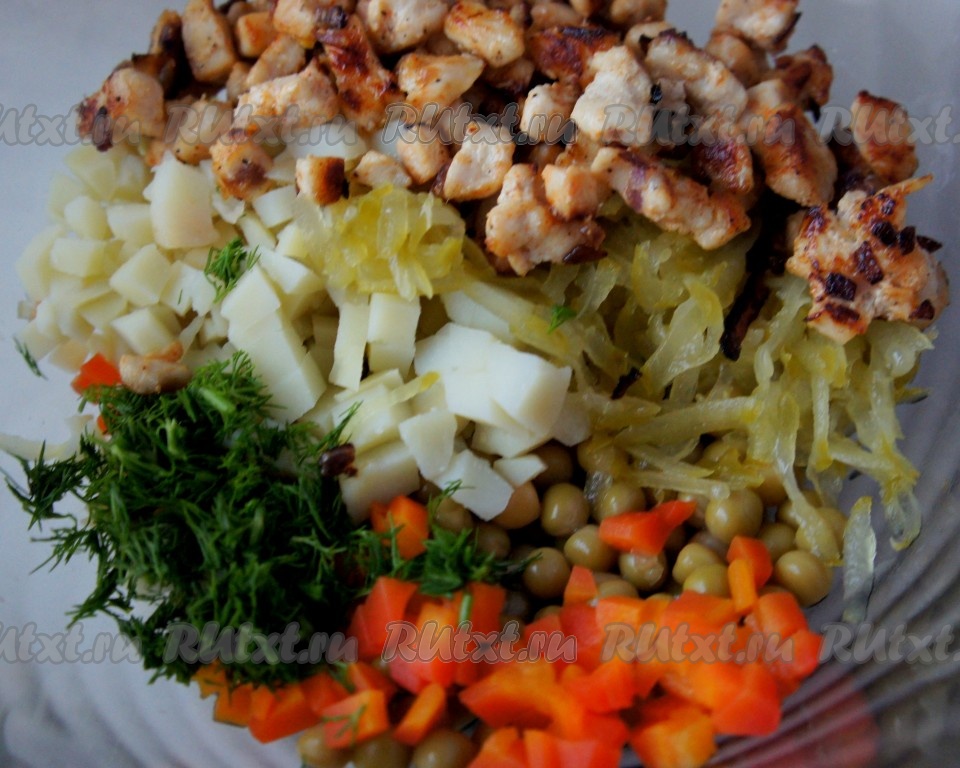 Добавить жареную куриную грудку с луком в салат (несколько кусочков мяса я оставила для украшения). Сюда же добавить мелко нарезанный укроп.