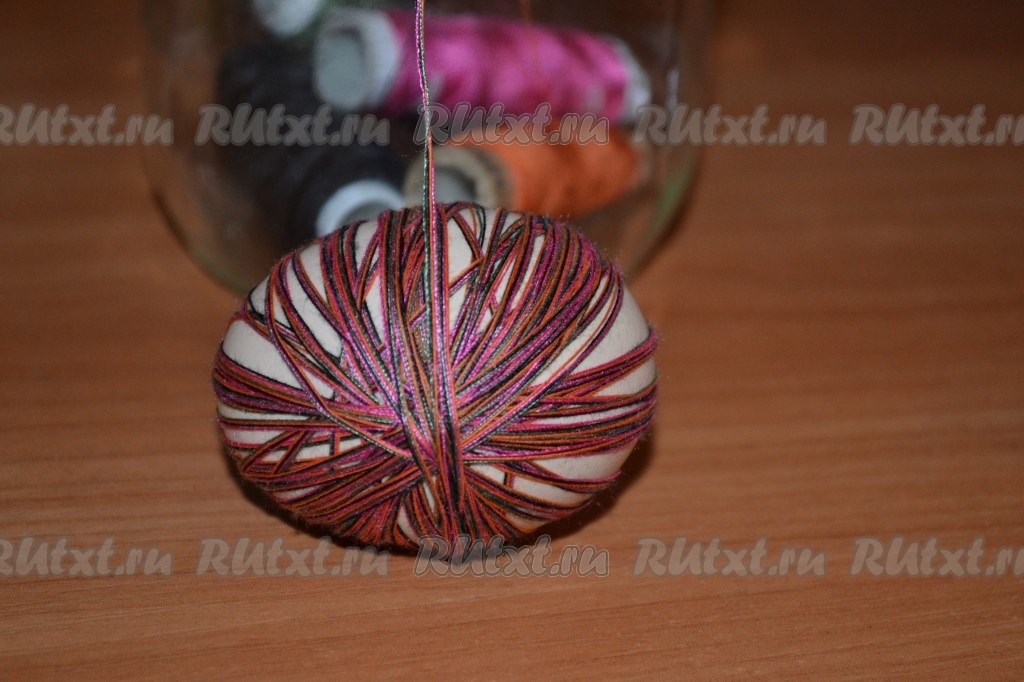 Сырые яйца вымыть и намотать на них в произвольном порядке нитки для шитья.