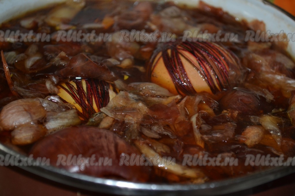 Вскипятить воду с луковой шелухой. В закипевший раствор с шелухой опустить обмотанные нитками яйца, варить до желаемого состояния желтка.