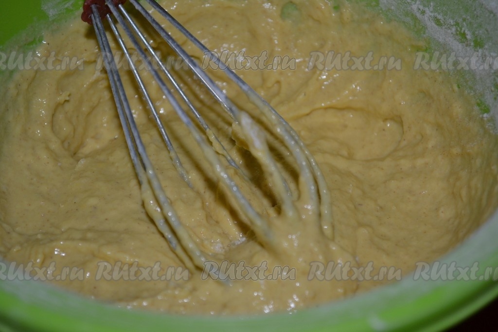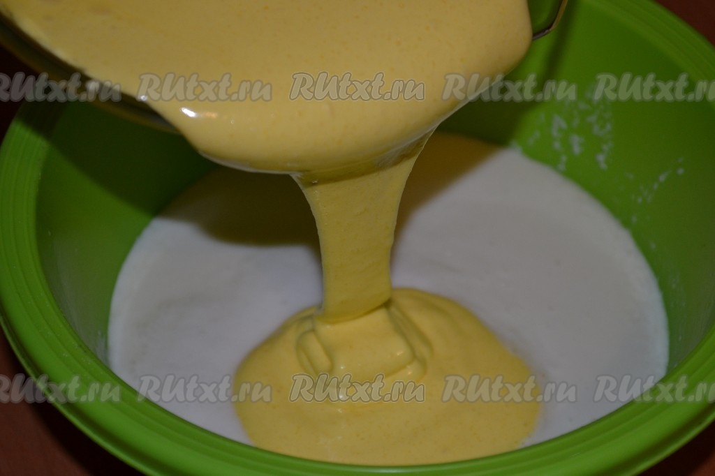 Влить в полученную яичную массу кефир. Аккуратно перемешать.