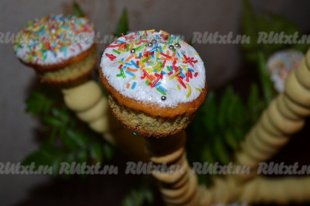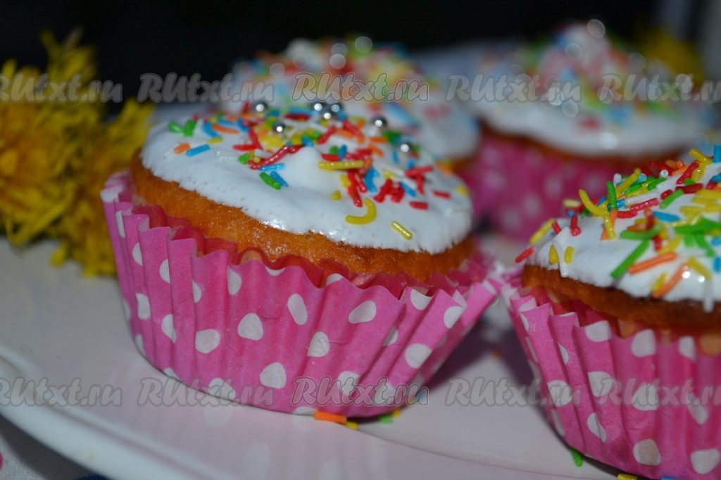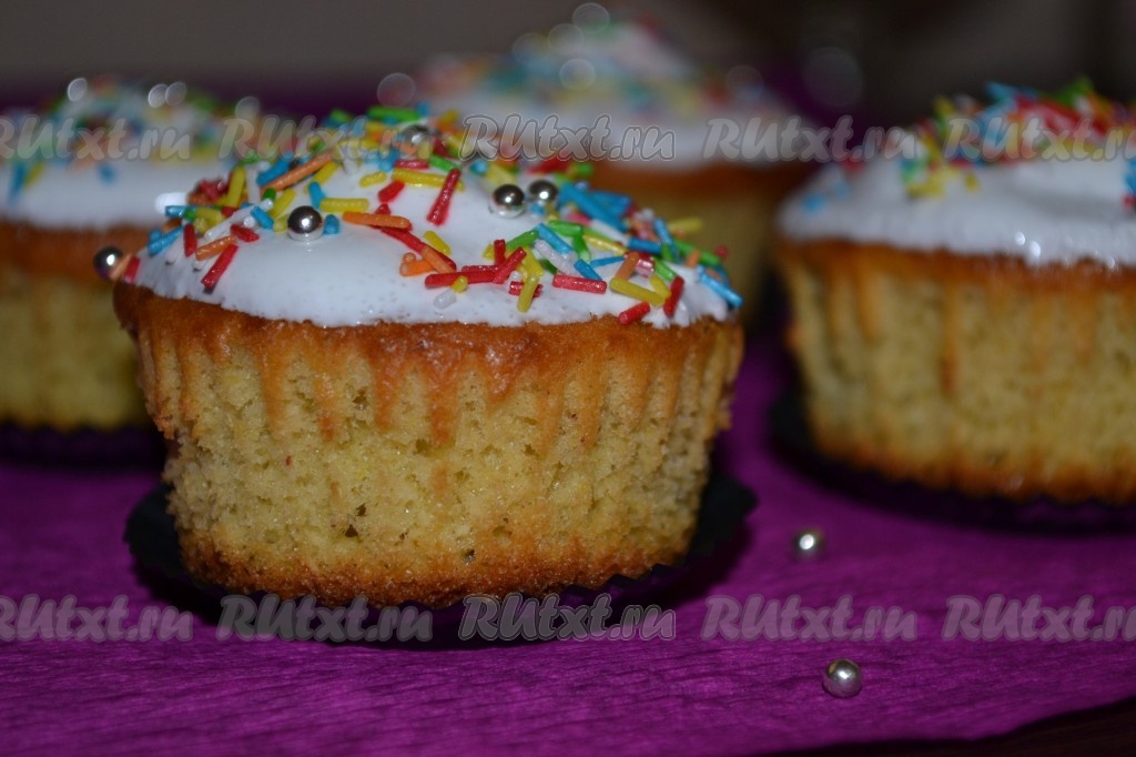Тесто хорошо перемешать и наполнить им формы для маффинов, заполняя на 2/3 объёма. Отправить на 20-25 минут в духовку, разогретую до 180 градусов. Пока выпекаются маффины, приготовим белковую глазурь для украшения: яичный белок взбить (он должен увеличиться в объёме в 2-3 раза), затем постепенно всыпать сахарную пудру и взбивать в течение 5 минут. Украсить верх готовых маффинов белковой глазурью и кондитерской посыпкой.