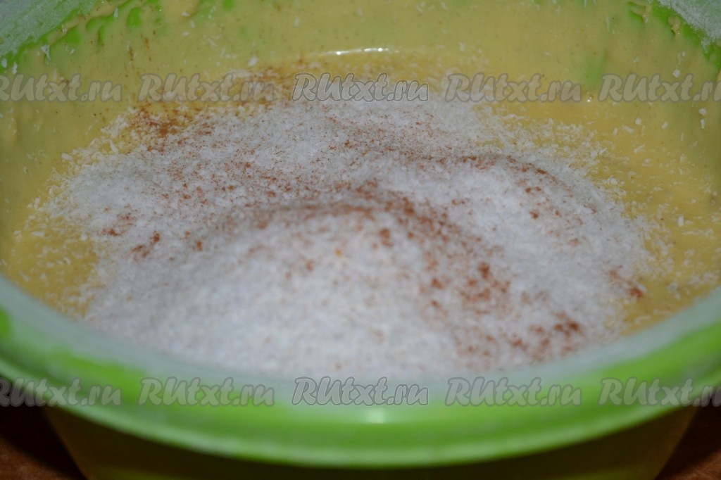 Добавить кокосовую стружку, молотую корицу и цедру, снятую с одного лимона.