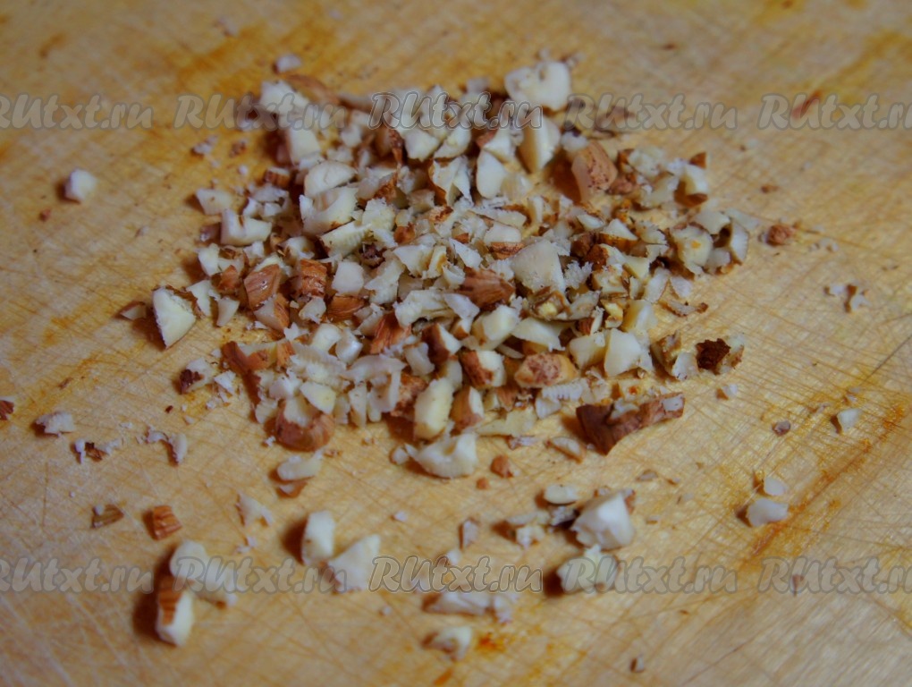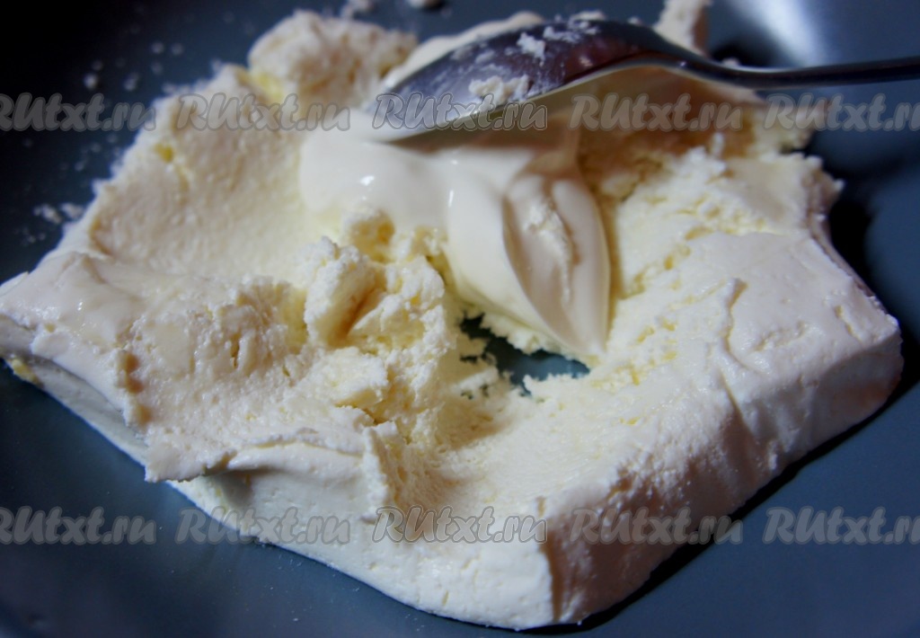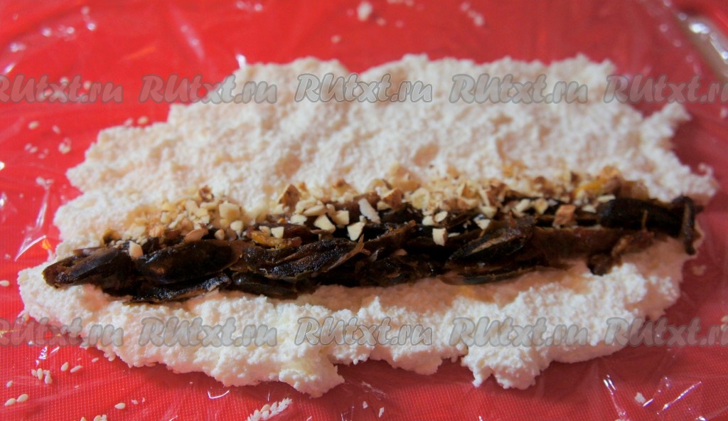 Творог разложить по периметру плёнки, добавить финики, фундук.