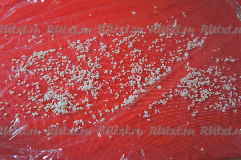 Расстелить пищевую пленку. Присыпать плёнку кокосовой стружкой и кунжутом.