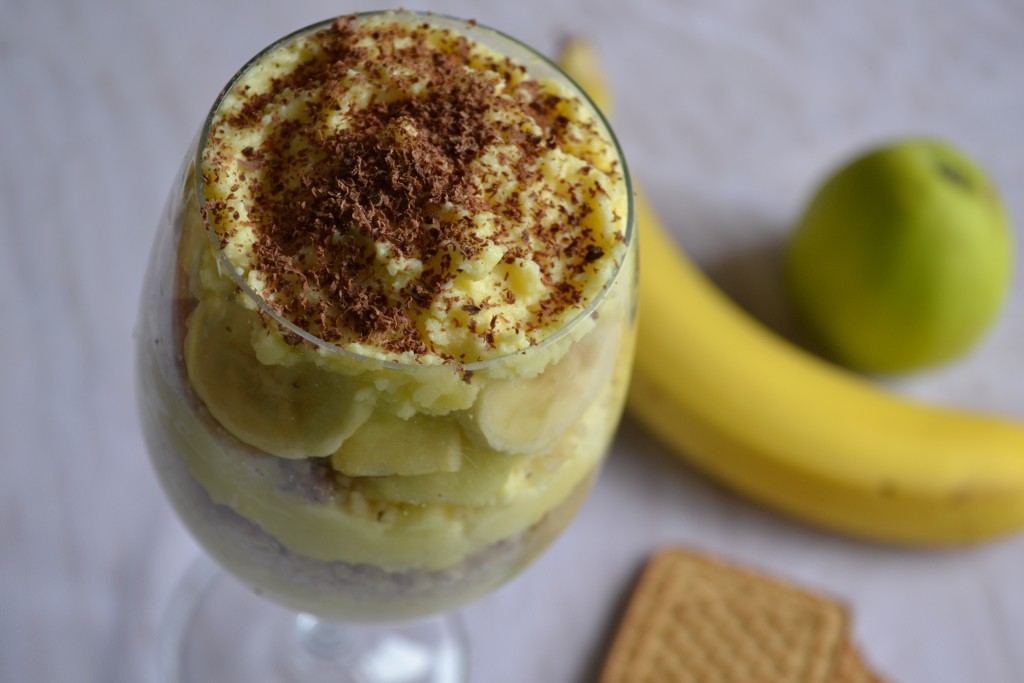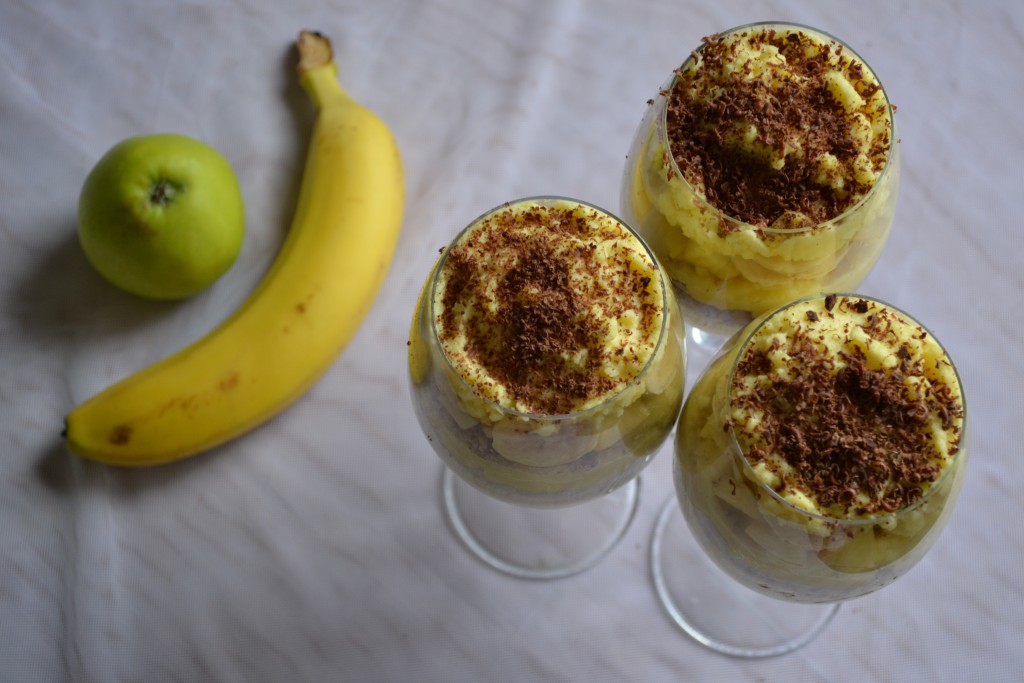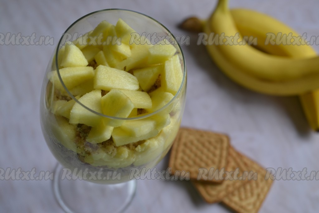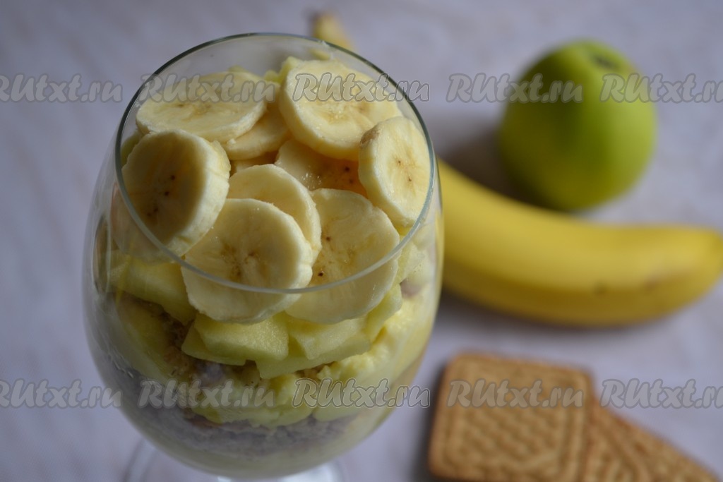 Из минимального количества ингредиентов достаточно быстро можно приготовить вкусный творожный десерт с фруктами, в котором будет присутствовать слегка солоноватая сырная масса, сладкое печенье, банан, шоколад и кисленькое яблоко. Ингредиенты можно урегулировать под свои вкусы и предпочтения.