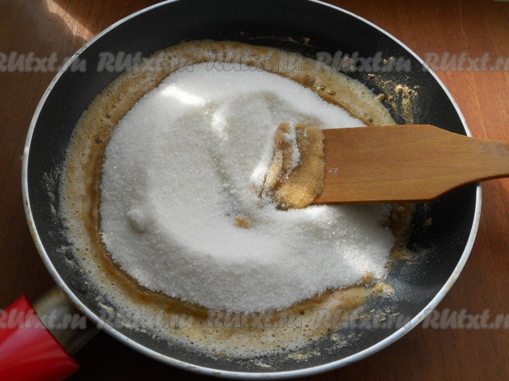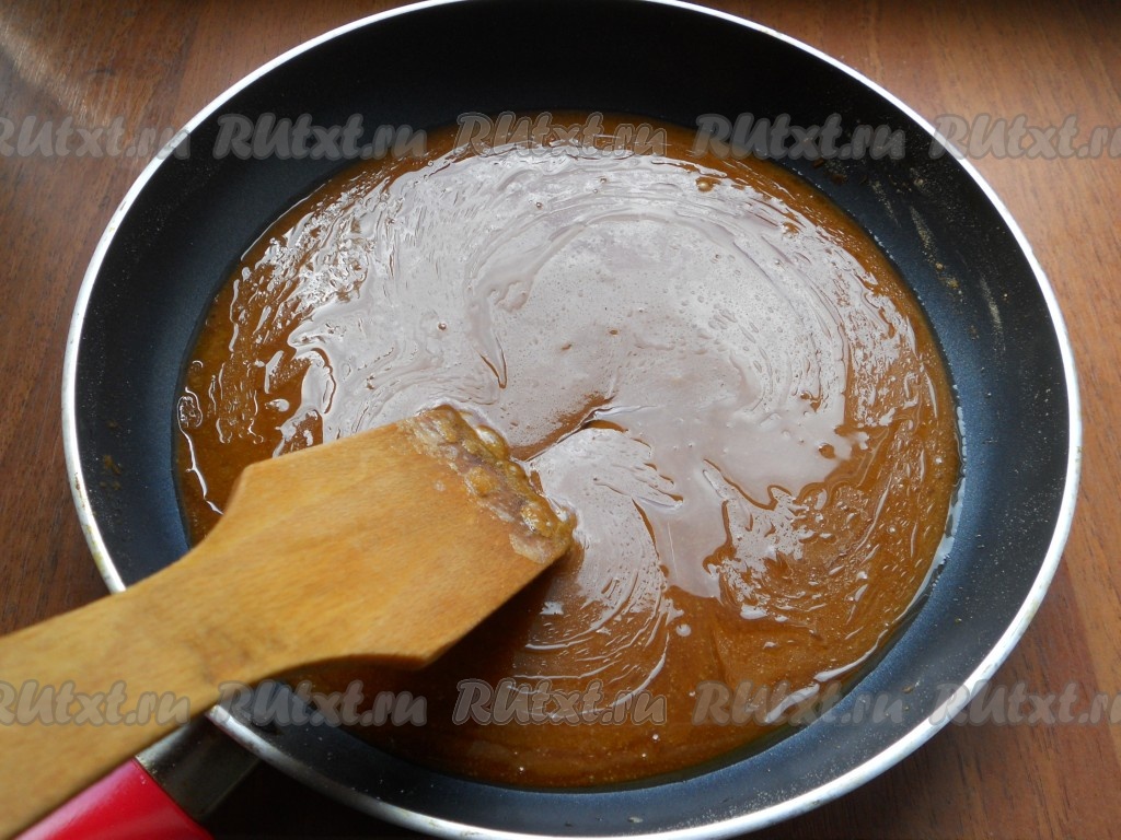 Держать сковороду на небольшом огне, помешивая, до полного растворения сахара. Получится тёмная карамельная масса.