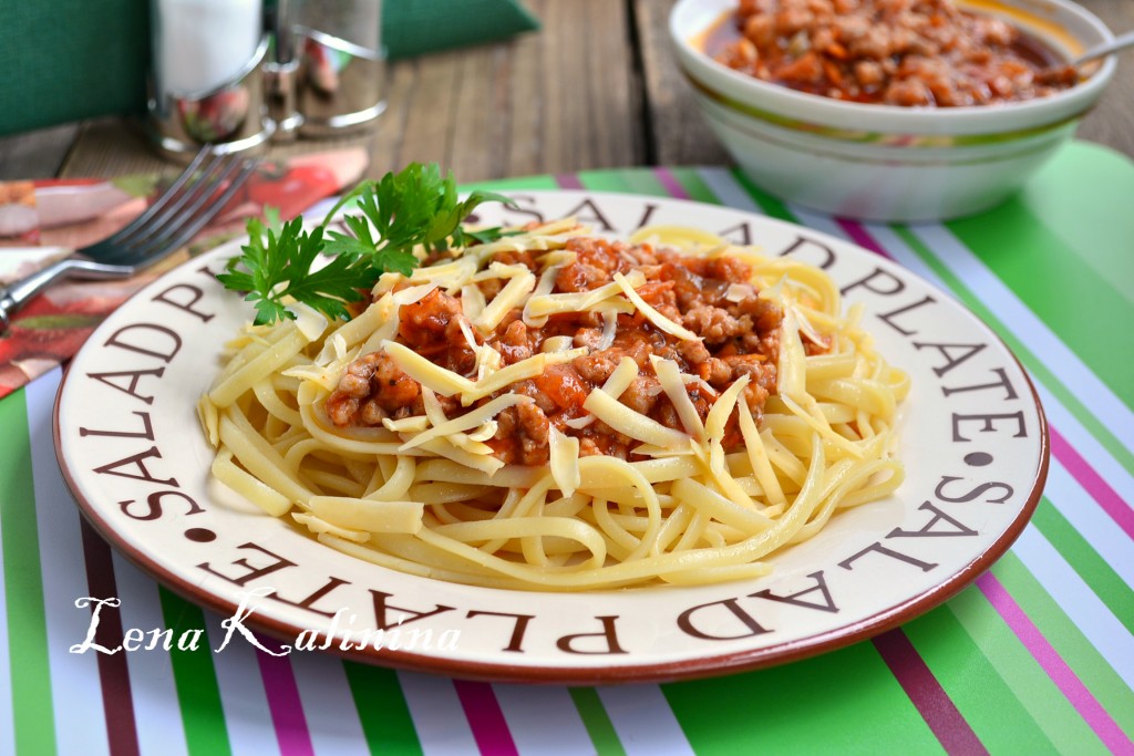 Спагетти с фаршем и томатной пастой - очень вкусное, сытное блюдо для разнообразия вашего повседневного стола. Фарш можно использовать любой (свиной, свино-говяжий, индюшиный, свинина + курица и т.д.), я готовила со свиным фаршем. Замечательное блюдо!