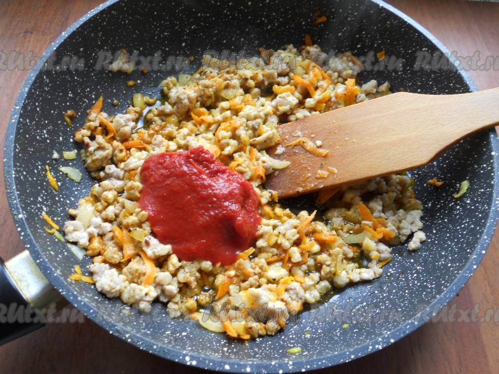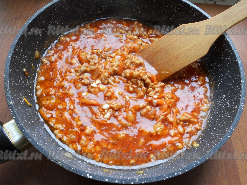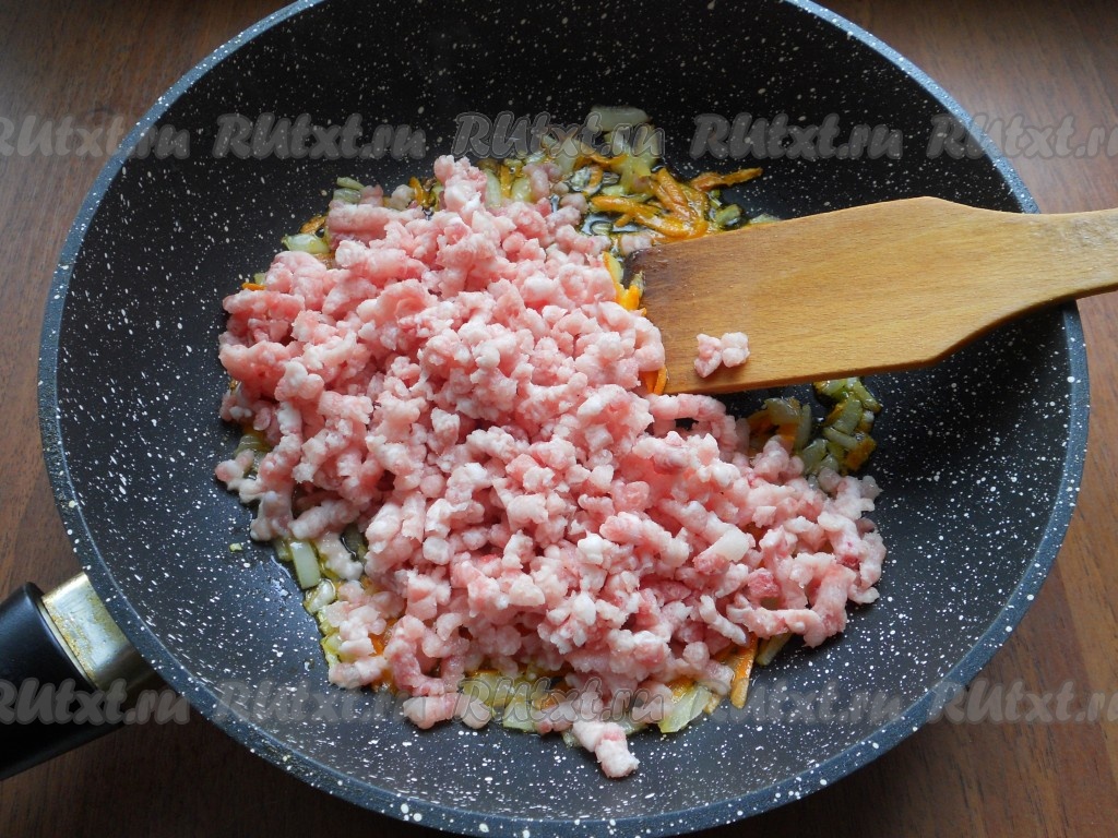 Обжарить овощи, помешивая, до мягкости, далее добавить в сковороду фарш.