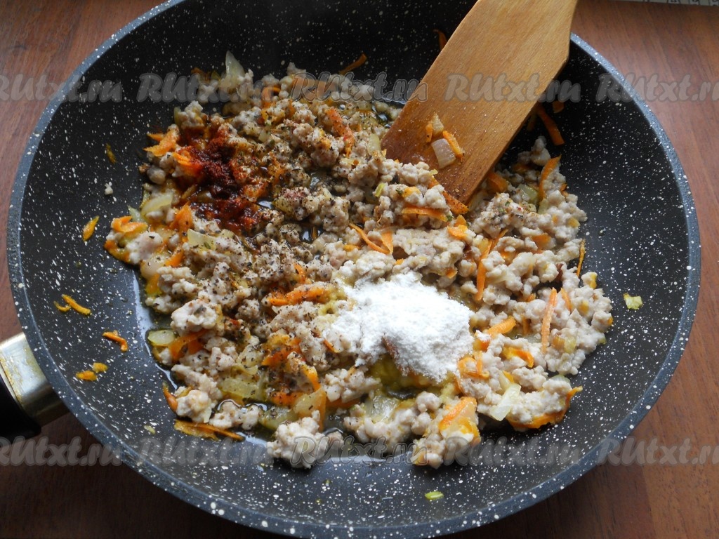 Обжарить фарш с овощами, периодически перемешивая, до изменения цвета. Добавить соль, паприку, свежемолотый перец и муку. Перемешать все.