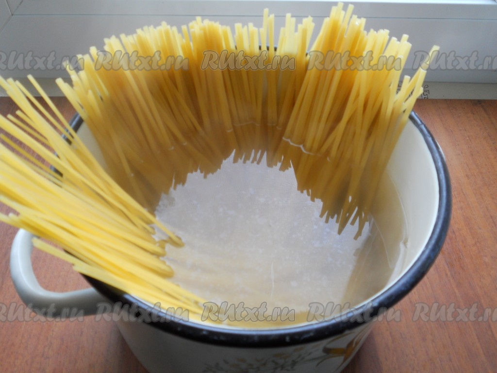 В кипящую подсоленную воду выложить спагетти и отварить до готовности, в соответствии с инструкцией на упаковке. Готовые спагетти откинуть на дуршлаг, воду слить. Спагетти переложить в кастрюлю, добавить сливочное масло и перемешать.
