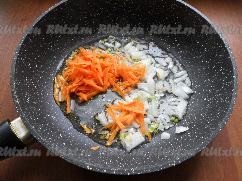 В сковороду с разогретым растительным маслом выложить репчатый лук, нарезанный небольшими кусочками, и натертую на крупной терке морковь.
